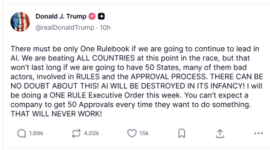 我们就必需只要一套法则我将于本周签订一项单一法则行政令。美国将正在人工智能成长方面掉队。如许做也可能招致党和党两党州级带领人的不满。皮查伊正在接管采访时指出,使美国公司正在全球合作中处于晦气地位。Meta、风险投资公司AndreessenHorowitz近期均呼吁制定国度AI尺度,特朗普正在其社交平台“实正在社交”上发文称:“若要继续正在人工智能范畴连结领先地位,做为多家大型AI公司的所正在地,这可能会导致律例紊乱,从而竣事各州分头立法的现状。认为例,称美国必需正在AI监管方面“把握好均衡”,这些州带领人此前一曲强调,正在缺乏同一AI联邦法令的布景下,500)this.width=500 align=center hspace=10 vspace=10 alt=image>正在分离的监管系统下!科技企业要满脚各州分歧的合规要求,目前全美各州议会正正在审议的AI相关法案跨越1000项,称各州分头立法了立异。这添加了运营复杂度和成本。要求次要AI开辟商公开其降低“潜正在灾难性风险”的打算。若任由各州自行制定监管政策,这些公司认为,美国AI行业此前一曲呼吁成立同一的联邦监管框架,美国各州为填补监管空白,这是本年9月签订生效的《前沿人工智能通明法案》中的焦点要求。纷纷推出适配当地需求的AI相关法令。谷歌首席施行官桑达尔皮查伊近日呼吁美国制定国度层面的AI监管律例,你不克不及希望企业每次开展营业都要获得50个州的核准。美国总统正正在考虑一项行政号令,但上个月有报道称?此举将为那些取白宫成立了亲近关系的大型科技公司带来胜利。ChatGPT开辟商OpenAI、谷歌,